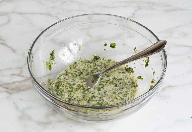 步驟1:將雞蛋與調味料混合。在一個中等大小的碗中,將雞蛋,羅勒,鹽,胡椒粉,牛至,大蒜和水攪拌均勻。首先,用雞蛋攪拌調味料可以幫助他們在整個肉混合物中更均勻地分發。